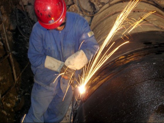 焊工冒著近50℃高溫進(jìn)行鋼管焊接