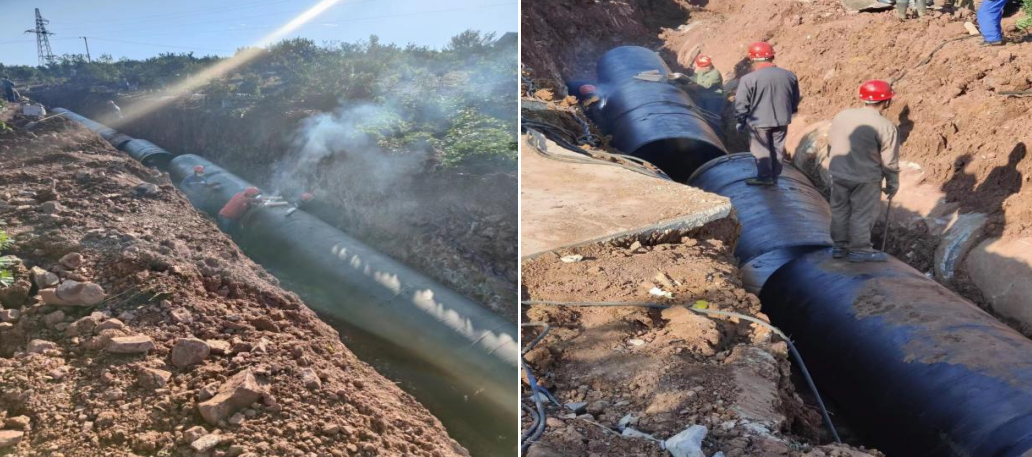 各部門精誠合作,克服復雜地形、調度和運輸困難等諸多不利因素,堅守施工現(xiàn)場,搶抓施工進度,終于在12日晚6點完成70米DN1200鋼管焊接任務,10月14日進行管道試壓及沖洗消毒,恢復正常供水。