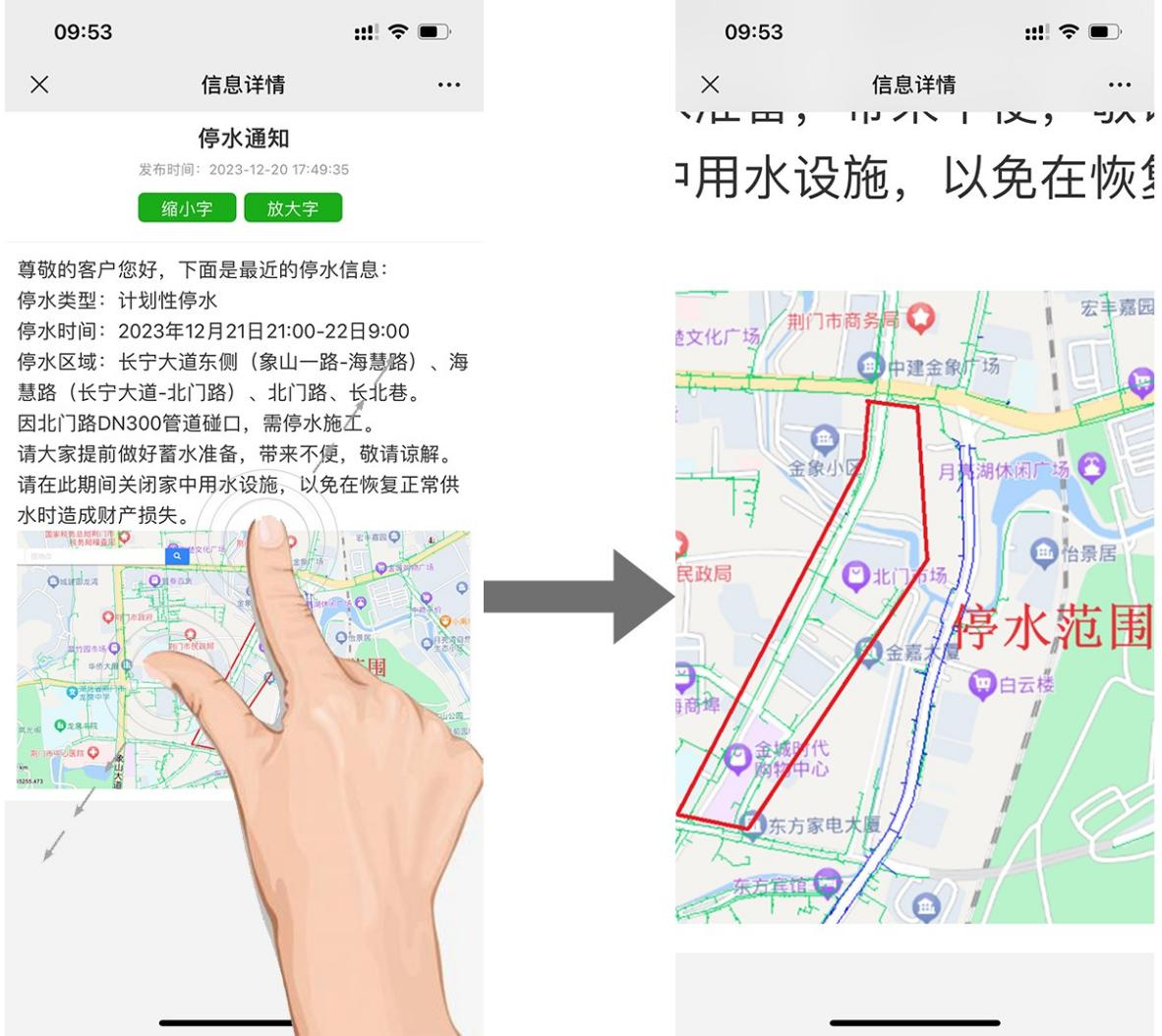 最新停水通知發(fā)出后,用戶通過【查看詳情】,點(diǎn)擊綠色【放大字】按鈕,可清晰查看停水類型、停水時(shí)間和停水區(qū)域。