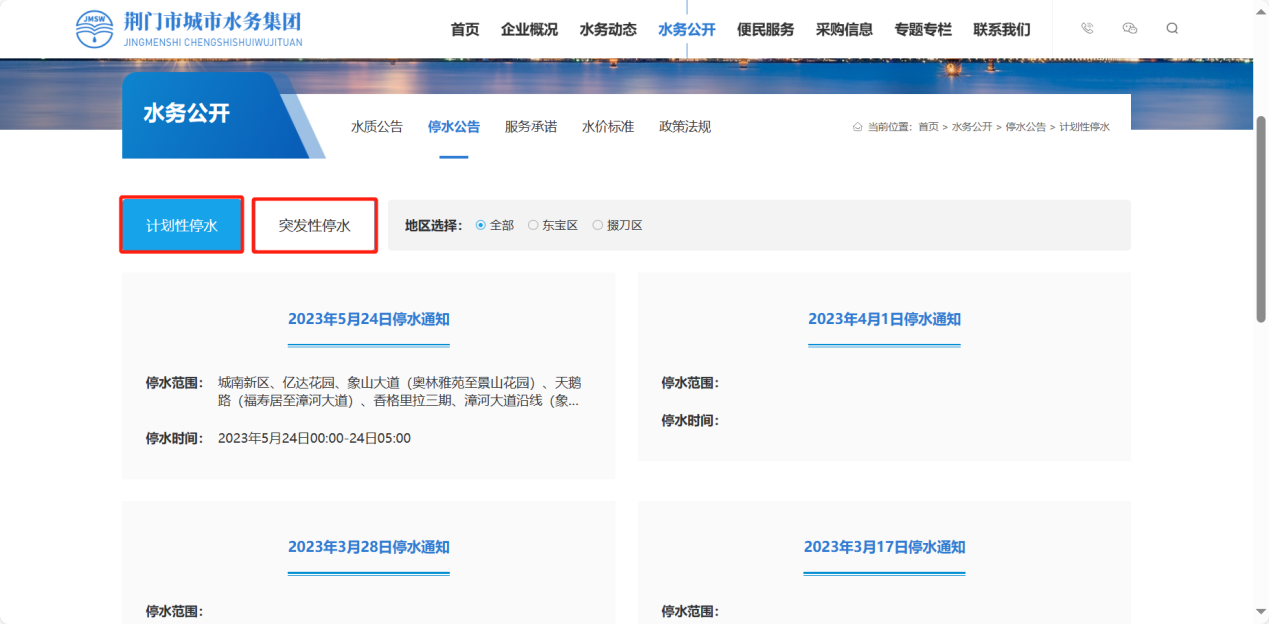 查看“計(jì)劃性停水”、“突發(fā)性停水”信息,值得一提的是,通過“地區(qū)選擇”查找會(huì)更方便哦!