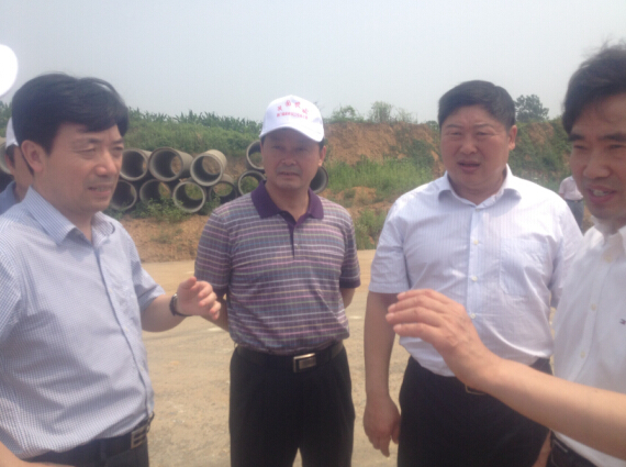 總經(jīng)理陳衛(wèi)國(guó)(中)和屈家?guī)X管理區(qū)工委書(shū)記湯旺林(右二)、工委主任鄭斌(左一)、市水務(wù)局局長(zhǎng)曾云(右一)商談施工事宜。