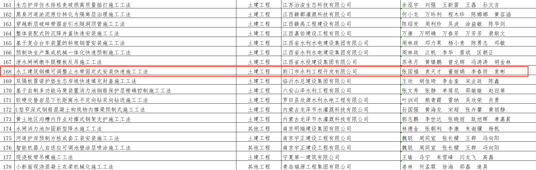 近日,中國(guó)水利工程協(xié)會(huì)公布了2025年度水利行業(yè)工法名單,荊門市城市水務(wù)集團(tuán)有限公司下屬單位荊門市水利工程開發(fā)有限公司(以下簡(jiǎn)稱“荊門水發(fā)”)申報(bào)的“水工建筑鋼模可調(diào)整止水帶固定式安裝快速施工工法”順利通過評(píng)審,正式被確認(rèn)為中國(guó)水利行業(yè)工法,為水利工程標(biāo)準(zhǔn)化、高效化建設(shè)提供了有力支撐。