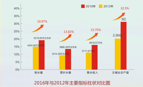2016年制水量達(dá)5219.83萬立方米,較2012年制水量4424.56萬立方米增長(zhǎng)19.97%;營(yíng)抄水量3886.28萬立方米,同比3414.38萬立方米增長(zhǎng)13.82%;售水收入6618.57萬元,同比5717.87萬元增長(zhǎng)15.75%;2016年公司主輔業(yè)總產(chǎn)值創(chuàng)歷史新高,首次突破3億元,同比2.26億元增長(zhǎng)32.5%。