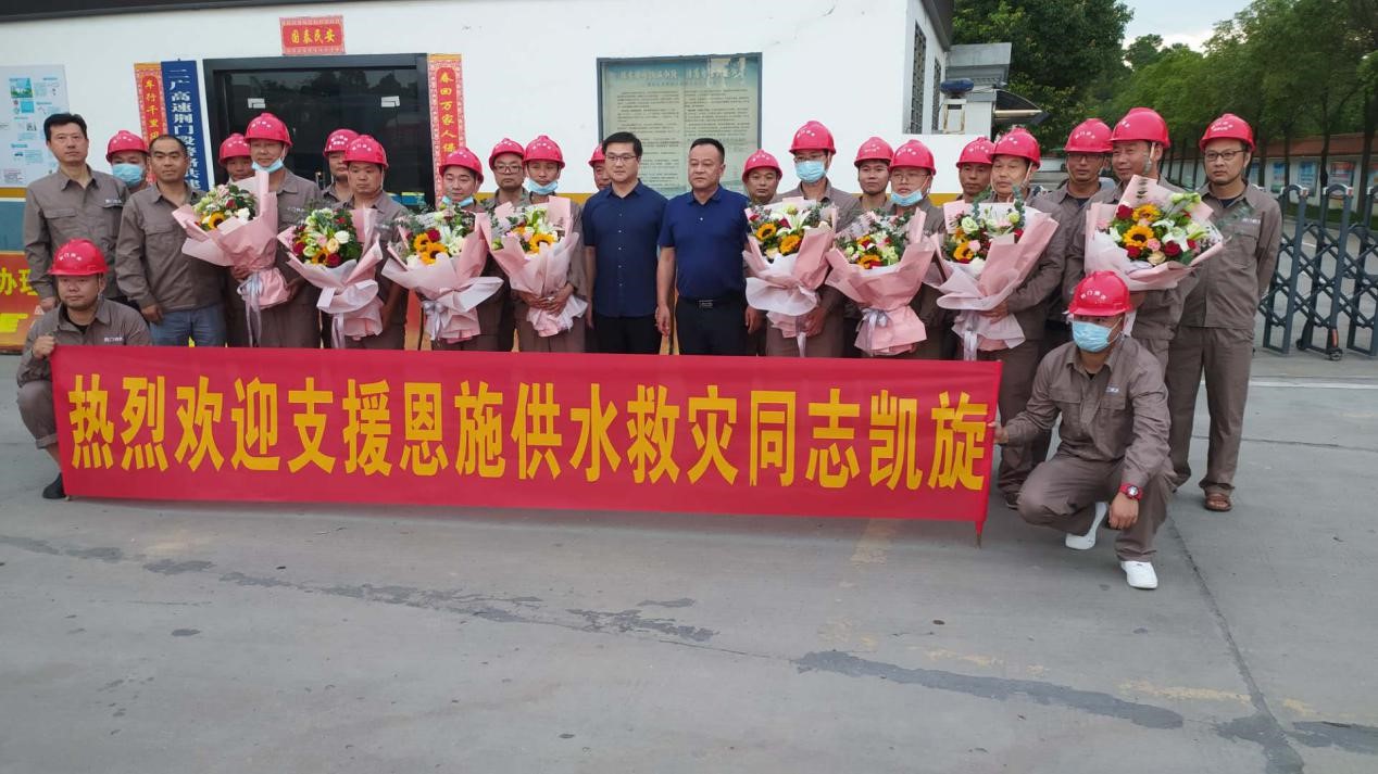 回想起赴恩施市的六天時(shí)間應(yīng)急供水救援經(jīng)歷,應(yīng)急供水救援隊(duì)隊(duì)長、維修公司副經(jīng)理羅紅勝回憶到,面對洪災(zāi)侵襲,大家總是在披星戴月與時(shí)間賽跑,連軸戰(zhàn)斗,一處受損設(shè)備、斷裂管道剛剛修復(fù),來不及休息,馬不停蹄又趕往下一個(gè)搶修點(diǎn)。他感慨地表示,赴恩施市救援不管怎么艱苦也沒什么,留下深刻的印象是特別熱情的當(dāng)?shù)厥忻袢罕姾退麄兊恼嬲\謝意。赴恩救援期間,公司黨委也十分關(guān)心8名灰衣甲士的后勤保障工作。7月25日下午,黨委書記、總經(jīng)理陳永根,黨委副書記、紀(jì)委書記徐黎明,黨委委員、總會計(jì)師劉高軼出差路過恩施期間專程慰問作戰(zhàn)人員,并要求公司相關(guān)部門全力做好住宿、就餐等后勤保障工作。