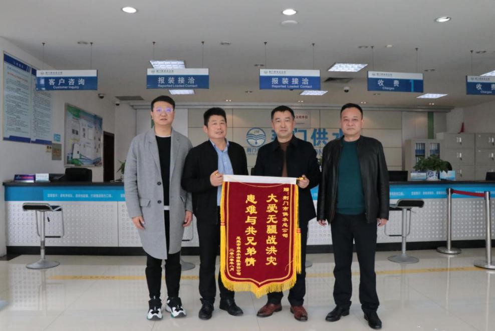 11月20日上午,恩施市自來水公司總經(jīng)理袁進(jìn)一行6人專程趕到荊門,向市供水總公司在恩施遭遇五十年一遇特大洪澇災(zāi)害的危難時(shí)刻給予傾情付出和無私幫助表示感謝,并贈(zèng)送寫有“大愛無疆戰(zhàn)洪災(zāi) 患難與共兄弟情”的錦旗。